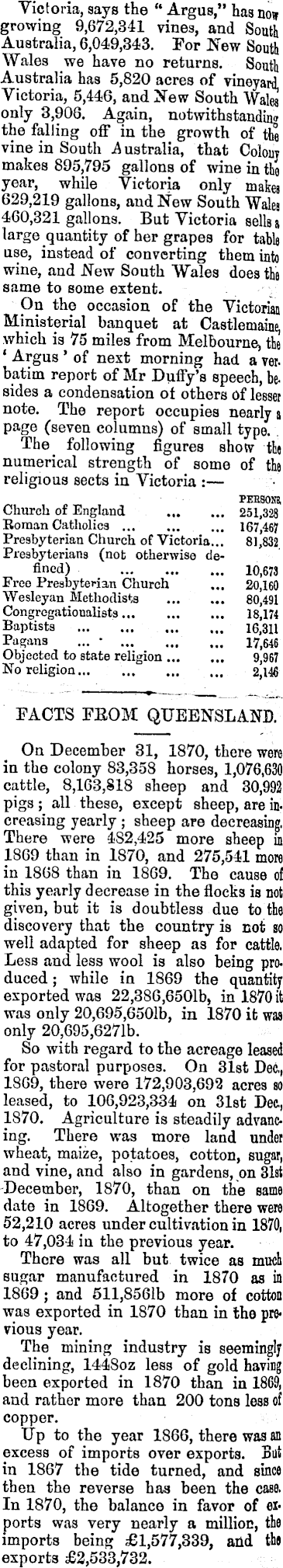 Victoria, says the " Argus," has now growing 9,672,341 vines, and South Australia, 6,049,343. For New South Wales we have no returns. South Australia has 5,820 acres of vineyard, Victoria, 5,446, and New South Wales only 3,908. Again, notwithstanding the falling off in the growth of the vine in South A ustralia, that Colony makes 895,795 gallons of wine in the year, while Victoria only makes 629,219 gallons, and New South Wales 460,321 gallons. But Victoria sells a large quantity of her grapes for table use, instead of converting them into wine, and New South Wales does the same to some extent. On the occasion of the Victorian Ministerial banquet at Castlemaine, which is 75 miles from Melbourne, the 1 Argus ' of next morning had a ver. batim report of Mr Duffy's speech, besides a condensation of others of lesser note. The report occupies nearly a page (seven columns) of small type. The following figures show the numerical strength of some of the religious sects in Victoria : PERSONS, Church of England 251,328 Boman Catholics 167,467 Presbyterian Church of Victoria... 81,832 Presbyterians (not otherwise defined) 10,673 Free Presbyterian Church ... 20,160 "Wesleyan Methodists 80,491 Congregationalists... ... ... 18,174 Baptists 16,311 Pagans ... ■ 17,646 Objected to state religion 9,967 No religion 2,146 FACTS FEOM QUEENSLAND. On December 31, 1870, there were in tho colony 83,358 horses, 1,076,630 cattle, 8,163,818 sheep and 30,992 pigs ; all these, except sheep, are increasing yearly ; sheep are decreasing, There were 482,425 more sheep in 1869 than in 1870, and 275,541 more in 1868 than in 18G9. The cause of this yearly decrease in the flocks is not given, but it is doubtless due to the discovery that the country is not so well adapted for sheep as for cattle, Less and less wool is also being produced ; while in 1869 the quantity exported was 22,386,6501b, in 1870 it was only 20,695,6501b, in 1870 it was only 20,695,6271b. So with regard to the acreage leased for pastoral purposes. On 31st Dec, 1869, there were 172,903,692 acres so leased, to 106,923,334 on 31st Dec., 1870. Agriculture is steadily advancing. There was more land under wheat, maize, potatoes, cotton, sugar, and vine, and also in gardens, on 31st December, 1870, than on the same date in 1869. Altogether there were 52,210 acres under cultivation in 1870, to 47,034 in the previous year. There was all but twice as much sugar manufactured in 1870 as in 1869 ; and 511,8561b more of cotton was exported in 1870 than in the previous year. The mining industry is seemingly declining, 14480z less of gold having been exported in 1870 than in 1869, and rather more than 200 tons less of copper. Up to the year 1866, there was an excess of imports over exports. But in 1867 the tide turned, and since then the reverse has been the case, In 1870, the balance in favor of exports was very nearly a million, the imports being £1,577,339, and the exports £2,533,732.