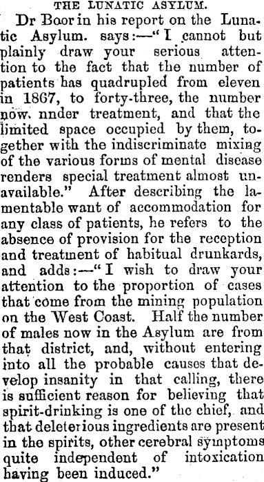 THE LUNATIC ASYLUM. Dr Boor in his report on the Lunatic Asylum, says:—" I cannot but plainly draw your serious attention to the fact that the number of patients has quadrupled from eleven in 1867, to forty-three, the number now. under treatment, and that the limited space occupied by them, together with the indiscriminate mixing of the various forms of mental disease renders special treatment almost unavailable." After describing the lamentable want of accommodation for any class of patients, he refers to the absence of provision for the reception and treatment of habitual drunkards, and adds: —"I wish to draw your attention to the proportion of cases that come from the mining population on the West Coast. Half the number of males now in the Asylum are from that district, and, without entering into all the probable causes that develop insanity in that calling, there is sufficient reason for believing that spirit-drinking is one of the chief, and that deleterious ingredients are present in the spirits, other cerebral symptoms quite independent of intoxication having been induced."