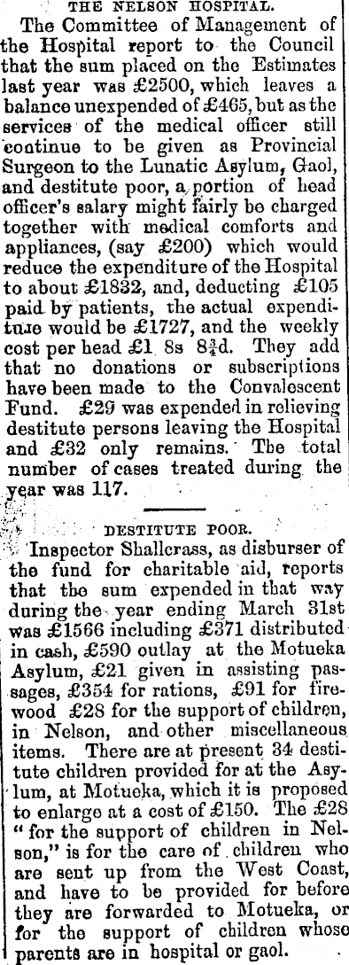 THE KELSON HOSPITAL. The Committee of Management of the Hospital report to the Council that the sum placed on the Estimates last year was £2500, which leaves a balance unexpended of £465, but as the services of the medical officer still coatinue to be given as Provincial Surgeon to the Lunatic Asylum, Gaol, and destitute poor, a, portion of head officer's salary might fairly be charged together with medical comforts and appliances, (say £200) which would reduce the expenditure of the Hospital to about £1832, and, deducting £lO5 paid by patients, the actual expenditure would be £1727, and the weekly cost per head £1 8s B£d. They add that no donations or subscriptions have been made to the Convalescent Fund. £29 was expended in relieving destitute persons leaving the Hospital and £32 only remains. The total number of cases treated during the year was H 7. £> DESTITUTE POOR. Inspector Shallcrass, as disburser of the fund for charitable aid, reports that the sum expended in that way during the year ending March 31st was £1566 including £371 distributed in cash, £590 outlay at the Motueka Asylum, £2l given in assisting passages, £354 for rations, £9l for firewood £2B for the support of children, in Nelson, and other miscellaneous items. There are at present 3-4 destitute children provided for at the Asylum, at Motueka, which it is proposed to enlarge at a cost of £l5O. The £2B " for the support of children in Nelson," is for the care of children who are sent up from the West Coast, and have to be provided for before they are forwarded to Motueka, or for the support of children whose parents are in hospital or gaol.