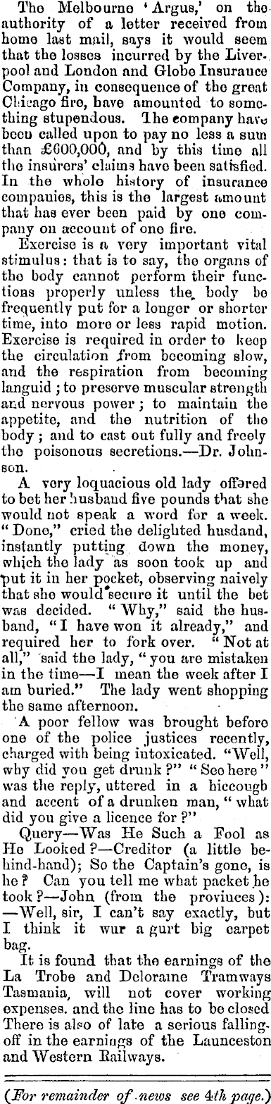 The Melbourno ' Argus,' on the authority of a letter received from homo last mail, Bays it would seem that the losses incurred by the Liverpool and London and Globe Insurance Company, in consequence of the great Chicago fire, have amounted to something stupendous, lho eompany have been called upon to pay no less a sum than £COO,OOO, and by this time all the insurers' chiitns have been satisfied. In the whole history of insurance companies, this is the largest amount that has ever been paid by one company on account of ono fire. Exercise is a very important vital stimulus: that is to say, the organs of the body cannot perform their functions properly unless the. body bo frequently put for a longer or shorter time, into more or less rapid motion. Exercise is required in order to keop the circulation from becoming slow, and the respiration from becoming languid ; to preserve muscular strength and nervous power; to maintain the appetite, and the nutrition of the body ; and to cast out fully and freely the poisonous secretions.—Dr. Johnson. A very loquacious old lady offared to bet her husband five pounds that she would not speak a word for a week. " Done," cried the delighted husdand, instantly putting down the money, which the lady as soon took up and put it in her pocket, observing naively that she would'secure it until the bet was decided. " Why," said the husband, " I have won it already," and required her to fork over. " Not at all," said the lady, " you are mistaken in the time —I mean the week after I am buried." The lady went shopping the same afternoon. A poor fellow was brought before one of the police justices recently, charged with being intoxicated. "Well, why did you get drunk ?" " See here " was the reply, uttered in a hiccough and accent of a drunken man, " what did you give a licence for ?" Query —Was He Such a Fool as He Looked ? —Creditor (a little be-hind-hand); So the Captain's gone, is he ? Can you tell me what packet he took? —John (from the provinces): —Well, sir, I can't say exactly, but I think it wur a gurt big carpet bag. It is found that the earnings of the La Trobe and Dcloravne Tramways Tasmania, will not cover working expenses, and the line has to be closed There is ateo of late a serious fallingoff in the earnings of the Launceston and Western Railways. (For remainder of news see 4/7* page.}