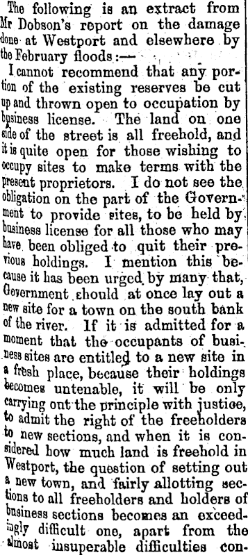 Tho following is an extract from Mr Dobson's report on the damage done at Weatport and elsewhere by tie February floods:—I cannot recommend that any portion of the existing reserves be cut up and thrown open to occupation by business license. The land on one Bde of the street is all freehold, and it is quite open for those wishing to occupy sites to make terms with the present proprietors. I do not see the obligation on the part of the Govern-" lent to provide sites, to be held by. business license for all those who may bave been obliged to quit their previous holdings. I mention this because it has been urged by many that, Government should at once lay out a new Bite for a town on the south bank of the river. If it is admitted for a moment that the occupants of business sites are entitled to a new site in I fresh place, because their holdings oecomes untenable, it will be only carrying out the principle with justice, to admit the right of the freeholders «• new sections, and when it is considered how much land is freehold in [ Westport, the question of setting out j & , new town, and fairly allotting aec- | bona to all freeholders and holders of | business sections becomes an exceedpty difficult ono, apart from the wnost insuperable difficulties con-