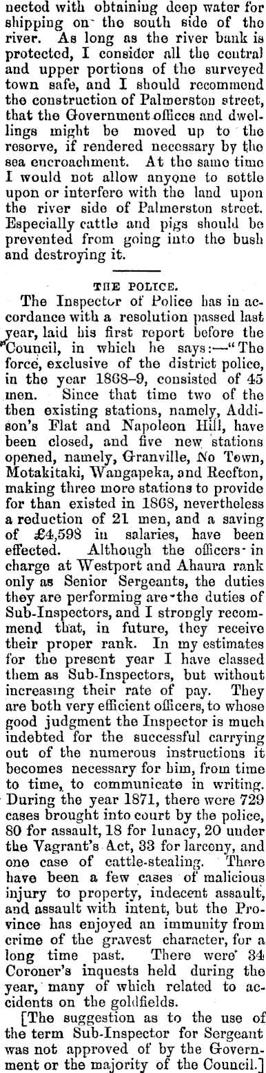 uectod with obtaining deep water for shipping on the south side of the river. As long as the river bank is protected, I consider all the central and upper portions of the surveyed town safe, and I should recommend the construction of Palmerston street, that the Government offices and dwellings might be moved up to the reserve, if rendered necessary by the sea encroachment. At the same time I would not allow anyone to sotfcle upon or interfere with the land upon the river side of Palmerston street. Especially cattle and pigs should be prevented from going into the bush and destroying it. THE POLICE. The Inspector of Police has in accordance with a resolution passed last year, laid his first report before the in which he says:—" The force, exclusive of the district police, in the year 1868-9, consisted of 45 men. Since that time two of the then existing stations, namely, Addison's Plat and Napoleon Hill, have been closed, and five nevy stations opened, namely, Granville, No Town, Motakitaki, Waugapeka, and Reefton, making three more stations to provide for than existed in 1868, nevertheless a reduction of 21 men, and a saving of £4,598 in salaries, have been effected. Although the officers ■in charge at Westport and Ahaura rank only as Senior Sergeants, the duties they are performing are-the duties of Sub-Inspectors, and I strongly recommend that, in future, they receive their proper rank. In my estimates for the present year I have classed them as Sub-Inspectors, but without increasing their rate of pay. They are both very efficient officers, to whose good judgment the Inspector is much indebted for the successful carrying out of the numerous instructions it becomes necessary for him, from time to time, to communicate in writing. During the year 1871, there were 729 cases brought into court by the police, 80 for assault, 18 for lunacy, 20 under the Vagrant's Act, 33 for larceny, and one case of cattle-stealing. There have been a few cases of malicious injury to property, indecent assault, and assault with intent, but the Province has enjoyed an immunity from crime of the gravest character, for a long time past. There were 34 Coroner's inquests held during the year, many of which related to accidents on the goldfields. [The suggestion as to the use of the term Sub-Inspector for Sergeant was not approved of by the Government or the majority of the Council.]