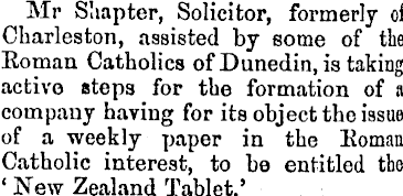 Mr Shapter, Solicitor, formerly of Charleston, assisted by some of the Eoman Catholics of Dunedin, is taking active steps for the formation of a company having for its object the issue of a weekly paper in the Eoman Catholic interest, to be entitled the ' New Zealand Tablet.'