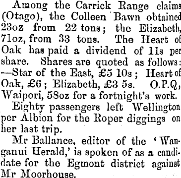 Among the Carrick Range claims (Otago), the Colleen Bawn obtained 230z from 22 tons; the Elizabeth, 71oz, from 33 tons. The Heart of Oak has paid a dividend of lis per share. Shares are quoted as follows: —Star of the East, £5 10s ; Heart of Oak, £6 ; Elizabeth, £3 ss. O.P.Q, Waipori, 58oz for a fortnight's work. Eighty passengers left Wellington per Albion for the Eoper diggings on her last trip. Mr Ballance, editor of the ' Wnnganui Herald,' is spoken of as a candidate for the Egtnout district against Mr Moorhouse.