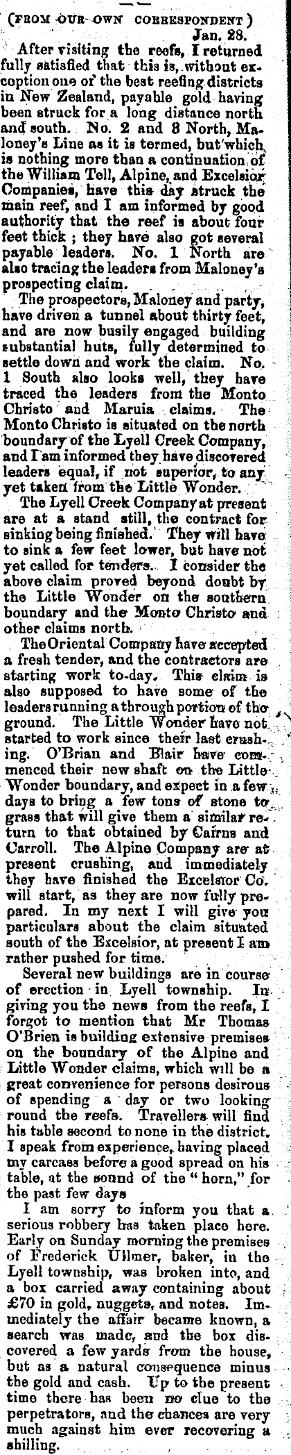 (FBOM OXTB- OWN" COBBEBPOKDENT ) Jan. 28. After visiting tbe reefo, I returned fully (satisfied that this is, without exception one of the beat reefing districts in New Zealand, payable gold having been struck for a long distance north and south. No. 2 and 8 North, Maloney's Line as it is termed, but which is nothing more than a continuation of the William Tell, Alpine, and Excelsior Companies, have this day struck the' main reef, and I am informed bj good authority that the reef is about four feet thick ; thej hare also got several payable leaders. No. 1 North are alio tracing the leaders from Maloney's prospecting claim. The prospectors, Maloney and party, have driven a tunnel about thirty feet, and are now busily engaged building substantial huts, fully determined to settle down and work the claim. No. 1 South also looks well, they hare traced the leaders from the Monto Christo and Maruia claims. The Monto Christo is situated on the north boundary of the Lyell Creek Company, and Lam informed they have discovered leaders equal, if not superior, to any yet taken from the Little Wonder. The Lyell Creek Company at present are at a stand still, the contract for sinking being finished. They will have to sink a few feet lower, but have not yet called for tenders. I consider the above claim proved beyond doubt by the Little Wonder on the southern boundary and the Monto Christo and other claims north. The Oriental Company have accepted a fresh tender, and the contractors are starting work to-day. This claim is also supposed to have some of the leaders running a through portion of the t ground. The Little Wonder have not started to work since their last crushing. O'Brian and Blair have commenced their new shaft on the LittleWonder boundary, and expect in a few , days to bring a few tons of stone tor. grass that will give them a similar return to that obtained by Cairns and Carroll. The Alpine Company are at present crushing, and immediately they have finished the Excelstor Co. will start, as they are now fully prepared. In my next I will give you particulars about the claim situated south of the Excelsior, at present I am rather pushed for time. Several new buildings are in course of erection in Lyell township. In giving you the news from the reefs, I forgot to mention that Mr Thomas O'Brien is building extensive premises on the boundary of the Alpine and Little Wonder claims, which will be a great convenience for persons desirous of spending a day or two looking round the reefs. Travellers will find his table second to none in the district. I speak from experience, having placed my carcass before a good spread on his table, at the sound of the " horn," for the past few days I am sorry to inform you that a serious robbery baa taken place here. Early on Sunday morning the premises of Frederick UHmer, baker, in the Lyell township, was broken into, and a box carried away containing about £7O in gold, nuggets, and notes. Immediately the affair became known, a search was made, and tbe box discovered a few yards - from tbe house, but as a natural consequence minus the gold and cash. Up to tbe present time there has been no clue to the perpetrators, and the chances are very much against him ever recovering a shilling.