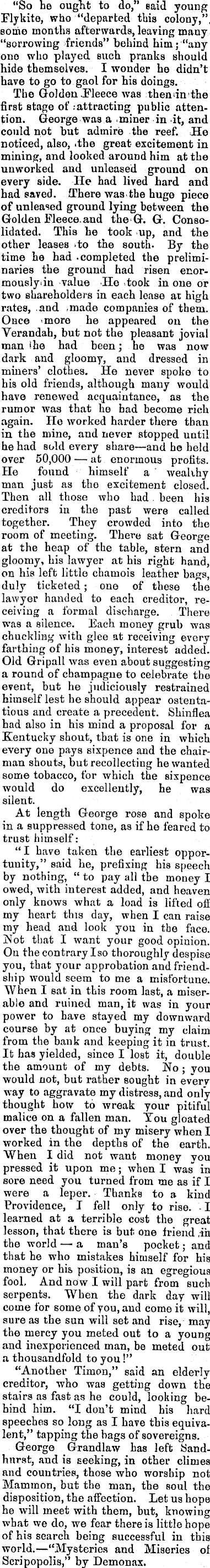 "So ho ought to do," said young Flykite, who "departed this colony,", some months afterwards, leaving many "sorrowing friends" behind him ; "any ono who played such pranks should hide themselves. I wonder he didn't have to go to gaol for his doings. The Golden Fleece was then in the first stage of -attracting public attention. George was a miner in it, and could not but admire the reef. He noticed, also, .the great excitement in mining, and looked around him at the unworked and unleased ground on every side. He had lived hard and had saved. .There was the huge piece of unleased ground lying between the Golden Fleece and the G. G. Consolidated. This he took up, and the other leases to the south. By the time ho had .completed the preliminaries the ground had risen enormously in value He took in one or two shareholders in each lease at high rates, and made companies of them. Once more he appeared on the Verandah, but not the pleasant jovial man 'he had been; he was now dark and gloomy, and dressed in miners' clothes. He never spoke to his old friends, although many would have renewed acquaintance, as the rumor was that he bad become rich again. Pie worked harder there than in the mine, and never stopped until he had sold every share—and he held over 50,000 —at enormous profits. He found himself a wealthy man just as tho excitement closed. Then all those who had been his creditors in the past were called together. They crowded into the room of meeting. There sat George at the heap of the table, stern and gloomy, his lawyer at his right hand, on his left little chamois leather bags, duly ticketed; one of these the lawyer handed to each creditor, receiving a formal discharge. There was a silence. Each money grub was chuckling with glee at receiving every farthing of his money, interest added. Old Gripall was even about suggesting a round of champagne to celebrate the event, but he judiciously restrained himself lest he should appear ostentatious and create a precedent. Shinflea had also in his mind a proposal for a Kentucky shout, that is one in which every one pays sixpence and the chairman shouts, but recollecting he wanted some tobacco, for which the sixpence would do excellently, he was silent. At length George rose and spoke in a suppressed tone, as if he feared to trust himself: " I have taken the earliest opportunity," said he, prefixing his speech by nothing, " to pay all the money I owed, with interest added, and heaven only knows what a load is lifted off my heart this day, when I can raise my head and look you in the face. Not that I want your good opinion. On the contrary I so thoroughly despise you, that your approbation and friendship would seem to me a misfortune. When I sat in this room last, a miserable and ruined man, it was in your power to have stayed my downward course by at once buying my claim from the bank and keeping it in trust. It has yielded, since I lost it, double the amount of my debts. No ; vou would not, but rather sought in everv way to aggravate my distress, and only thought how to wreak your pitiful malice on a fallen man. You gloated over the thought of my misery when I worked in the depths of the earth. When I did not want money vou pressed it upon me; when I was" in sore need you turned from me as if I were a leper. Thanks to a kind Providence, I fell only to rise. I learned at a terrible cost the great lesson, that there is but one friend ,-ih the world a man's pocket; and that he who mistakes himself for his money or his position, is an egregious fool. And now I will part from such serpents. When the dark day will come for some of you, and come it will, sure as the sun will set and rise, may the mercy you meted out to a young and inexperienced man, be meted out a thousandfold to you !" "Another Timon," said an elderly creditor, who was getting down the stairs as fast as he could, looking behind him. "I don't mind his hard speeches so long as I have this equivalent," tapping the bags of sovereigns. George Grandlaw has left Sandhurst, and is seeking, in other climes and countries, those who worship not Mammon, but the man, the soul the disposition, the affection. Let us hope he will meet with them, but, knowing what we do, we fear there is little hope of his search being successful in this world.—"Mysteries and Miseries of Scripopolis," by Demonax.