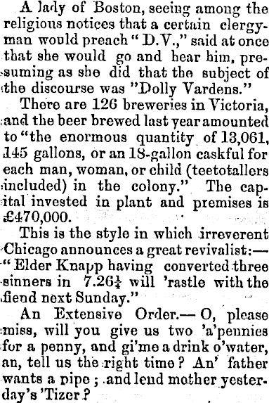 A lady of Boston, seeing among the religions notices that a certain clergyman would preach " D.V.," said at once that she would go and hear him, presuming as she did that the subject of ■the discourse was "Dolly Vardens." There are 126 breweries in Victoria, and the beer brewed last year amounted to "the enormous quantity of 13,061, 115 gallons, oranlß-gallon caskfulfor each man, woman, or child (teetotallers :included) in the colony." The capital invested in plant and premises is £170,000. This is the style in which irreverent Chicago announces a great revivalist:— " Elder Knapp having converted three sinners in 7.26£ will 'rastle with the fiend next Sunday." A.n Extensive Order.— O, please miss, will you give us two Vpeunies for a penny, and gi'me a drink o'water, au, tell us the right time ? An' father wants a pipe ; and lend mother yesterday's'Tizer?
