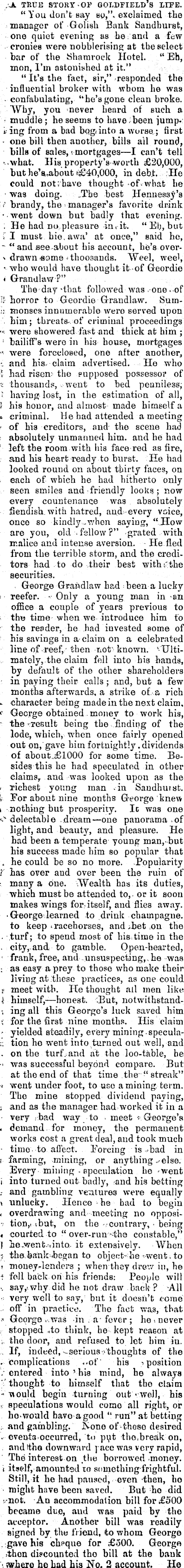 A TRUE STORY OF GOI.DFIELD's LIFE. " You don't say bo,", exclaimed the manager of Golish Bank Sandhurst, one quiet evening as be and a few cronies were nobblerising at the select bar of the Shamrock Hotel. " Eh, mon, I'm astonished at it." " It's the tact, sir," responded the influential broker with whom he was confabulating, "he'sgone clean broke. Why, you never heard of such a muddle ; he seems to have been jumpu ing from a bad bog into a worse; first one bill then another, bills ail round, bills of sales, .mortgages —I can't tell what. His property's worth £20,000, but he'euabout r£40,000, in deb.t. He could not; have thought of what he was doing. The best Hennessy's brandy, the manager's favorite drink went down but badly that evening. . He had no pleasure in. it. " Eh, but I must hie.awa' at once," said he, " and see about his account, he's overdrawn some thoosands. Weel, weel, • "who would have thought it of Geordie i Grandlaw ?" The day that followed was one of horror to Geordie Grandlaw. Sum- ; mouses innumerable were served upon him; threats of criminal proceedings were showered fast and thick at him ; bailiff's were in his house, mortgages were foreclosed, one after another, and his claim advertised. He who bad risen the supposed possessor of thousands, went to bed penniless, having lost, in the estimation of all, i his honor, and almost made himself a • criminal. Vie had attended a meeting - of his creditors, and the scene had -. absolutely unmanned him. and he bad I left the room with his face red as fire, i and his heart ready to burst. He bad looked round on about thirty faces, on ■ each of which he had hitherto only seen smiles and friendly looks ; now every countenance was absolutely fiendish with hatred, and every voice, once so kindly ..when saying, "How are you, old fellow ?" grated with malice and intense aversion. He fled from the terrible storm, and the creditors had to do their best with the securities. George Grandlaw had been a lucky reefer. ■ Only a young man in an office a couple of years previous to the time when we introduce him to the reader, he had invested some of his savings in a claim on a celebrated line of reef, then not known. Ultimately, the claim fell into hia hands, by default of the other shareholders in paying their calls ; and, but a few months afterwards, a strike of a rich character being made in the next claim, < George obtained money to work his, the result being tho finding of the lode, which, when once fairly opened out on, gave him fortnightly. dividends of about £IOOO for some time. Besides this he had speculated in other claims, and was looked upou as the . richest young man in Sandhui st. . For about nine months George knew i nothing but prosperity. Ic was one ■ delectable dream —one panorama of light, and beauty, and pleasure. He had been a temperate young man, but his success made him so popular that he could be so no more. Popularity has over and over been the ruin of many a one. Wealth has its duties, which must be attended to, or it soon makes wings for itself, and flies away. George learned to drink champagne. to keep racehorses, and ,bet on the turf; to spend most of his time in the city, and to gamble. Open-hearted, frank, free, and unsuspecting, he was : as easy a prey to those who make their living at these practices, as one could : meet with. He thought all men like • himself, —honest. But, notwithstand- . ing all this George's luck saved him for the first nine months. His claim yielded steadily, every mining specula- . tion ho went into turned out well, and on the turf and at the 100-table, he was successful beyond compare. But at the end of that time the " streak" went under foot, to use a mining term. The mine stopped dividend paying, , and as the manager had worked it in a very bad way to meet George's . demand for money, the permanent works cost a great deal, aud took much time to affect. Forciug is bad in . farming, mining, or anything else. Every mining npeculation ho went , into turned out badly, and bis betting . and gambling ventures were equally unlucky. Hence he had to begin . overdrawing and meeting no opposition,, -.but, on the contrary, being ■ courted to " over-run tho constable," i he .went.■>into it extensively. When - the bank began to object -he went. to money-lenders ; when they drew in, he fell back on his friends: People will say, why did he not draw back ? All very well to say, but. it doesn't come off in practice. The fact wa.B, that George was in a fever; he. never stopped to think, he kept reason at the door, and refused to let him in. If, indeed, serious thoughts of the complications -of his position entered into ' bis mind, he always thought to himself that tho claim • would begin turning out - well, his speculations would come all right, or ho would have a good " run" at betting and gambling. None of-those desired events occurred, to put the.break on, and 'the downward ] ace was very rapid, The interest on the borrowed money, itself, amounted to something-frightful. Still, it he had paused, even then, ho might have been saved. But ho did not. An accommodation bill for £SOO became due, aud was paid by the acceptor. Another bill was readily signed by the friend, to whom George gave his chpque for £SOO. George then discounted tho bill at the bank where ho had his No. 2 account. He