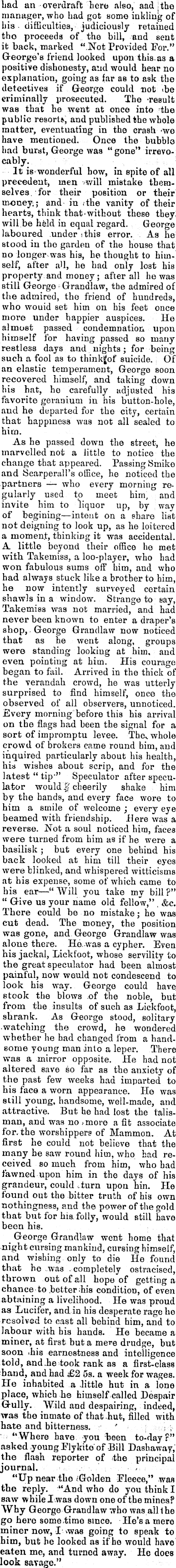 had an overdraft here also, aad tho manager, who had got some inkling of his difficulties, judiciously retained tho proceeds of the bill, and sent it back, marked "Not Provided Eor." George's friend looked upon this as a positive dishonesty, aud would hear no explanation, going as far a 8 to ask the detectives if George could not >be criminally prosecuted. The result was that he went at once into the public resort*, and published the whole matter, eventuating in the crash we have mentioned. Once the bubble had burst, George was " gone" irrevocably. It is wonderful how, in spite of all precedent, men will mistake themselves for their position or their m-oney; and in the vanity of their hearts, think that without these they will be held in equal regard. George laboured under this error. As he stood in the garden of the house that no longer was bis, he thought to himself, after a'l, he bad only lost his property and money; after all he was still George Grandlaw, the admired of the admired, the friend of hundreds, who wouid set him on his feet once more under happier auspices. He almost passed condemnation upon himself for having passed so many restless days and nights; for being such a fool as to thinkgof suicide. Of an elastic temperament, George soon recovered himself, and taking down his hat, he carefully adjusted his favorite geranium in his button-hole, and he departed for the city, certain that happiness was not all sealed to him. As he passed down the street, he marvelled not a little to notice the change that appeared. Passing Smike and Scarperall's office, he noticed the partners who every morning regularly used to meet him, and invite him to liquor up, by way of begining—intent on a share list not deigning to look up, as he loitered a moment, thinking it was accidental. A little beyond their office he met with Takemiss, a 100-player, who had won fabulous sums off him, and who had always stuck like a brother to him, he now intently surveyed certain shawls in a window. Strange to say, Takemiss was not married, and had never been known to enter a draper's shop, George Grandlaw now noticed that as he went along, groups were standing looking at him. and even pointing at him. His courage began to fail. Arrived in the thick of the verandah crowd, he was utterly surprised to find himself, once the observed of all observers, unnoticed. Every morning before this his arrival on the flags had been the signal for a sort of impromptu levee. The,, whole crowd of brokers came round him, and inquired particularly about his health, his wishes about scrip, and for the latest " tip - " Speculator after speculator would; cheerily shake him by the hands, and every face wore to him a smile of welcome ; every eye beamed with friendship. Here was a reverse. Not a soul noticed him, faces were turned from him as if he were a basilisk ; but every one behind his back looked at him till their eyes were blinked, and whispered witticisms at his expense, some of which came to his ear—" Will you take my bill ?" " Give us your name old fellow," &c. There could be no mistake; he was cut dead. The money, the position was gone, and George Grandlaw was alone there. He was a cypher. Even his jackal, Lickfoot, whose servility to the great speculator had been almost painful, now would not condescend to look his way. George could have stook the blows of the noble, but from the insults of such as Lickfoot, shrank. As George stood, solitary watching the crowd, he wondered whether he had changed from a handsome young man into a leper. There was a mirror opposite. He had not altered save so far as the anxiety of the past few weeks had imparted to his face a worn appearance. He was still young, handsome, well-made, and attractive. But he had lost the talisman, and was no more a fit associate for. the worshippers of Mammon. At first he could not believe that the many he saw round him, who had received so much from him, who had fawned upon him in the days of his grandeur, could turn upon hin. He found out the bitter truth of his own nothingness, and the power of the gold that but for his folly, would still have been his. George Grandlaw went home that night cursing mankind, cursing himself, and wishing only to die He found that he was completely ostracised, thrown out of all hope of getting a chance to better bis condition, of even abtaining a livelihood. He was proud as Lucifer, and in his desperate rage be resolved to cast all behind him, and to labour with bis hands. He became a miner, at first but a mere drudge, but soon ,his earnestness and intelligence told, and .he took rank as a first-class baud, and had £2 ss. a week for wages. He inhabited a little hut in a lone place, which he himself called Despair Gully. Wild and despairing, indeed, was the inmate of that hut, filled with hate and bitterness. "Where have you been to-day?" asked young Elykito of Bill Dashaway, the flash reporter of the principal journal. "Up near the -Golden Fleece," was the reply. "And who do you think I saw while I was down one of the mines? Why George Grandlaw who was aillhe go here some timo since. He's a mere miner now, I was going to speak to him, but he looked as if ho would have eaten me, and turned away. He does look savage."
