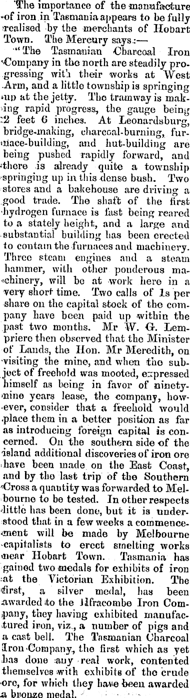 The importance of the •maniffaicture -of iron in Tasmania appears to be fully 'realised by the merchants of Hobart Town. The Mercury says.: — "The Tasmanian Charcoal Iron Company in the north are steadily progressing with their works at West Arm, and a little township is springing nip at the jetty. The tramway is making rapid progress, the gauge being -2 feet 6 inches. At Leonardsburg, bridge-making, charcoal-burning, fur-tnace-building, and hut-building are being pushed rapidly forward, and ; there is already quite a township springing up in this dense bush. Two stores and a bakehouse are driving a good trade. The shaft of the first hydrogen furnace is fast being reared to a stately height, and a large and substantial building has been erected to contain the furnaces aud machinery. Three steam engines and a steam hammer, with other ponderous machinery, will bo at work here in a very short time. Two calls of Is petshare on the capital stock of the company have been paid up within the past two months. Mr W. G. Lempriere then observed that the Minister of Lands, the Hon. Mr Meredith, on •visiting the mine, and when tho subject of freehold \vas mooted, expressed himself as being in favor of ninetynine years lease, the company, however, consider that a freehold would .place them in a better position as far as introducing foreign capital is concerned. On the southern side of the island additional discoveries of iron ore have been made on the East Coast, and by tho last trip of the Southern Cross a quantity was forwarded to Melbourne to be tested. In other respects little has been done, but it is understood that in a few weeks a commence•ment will be made by Melbourne capitalists to erect smelting works oienr Hobart Town. Tasmania has gained two medals for exhibits of iron at the Victorian Exhibition. The first, a silver medal, has been Awarded *o the Jifracombo Iron Company, they having exhibited manufactured iron, viz, a number of pigs and a cast bell. The Tasmanian Charcoal Iron' Company, the first which as yet has done any real work, contented themselves with exhibits of the crude ore, for which they have been awarded ii buouzo medal.