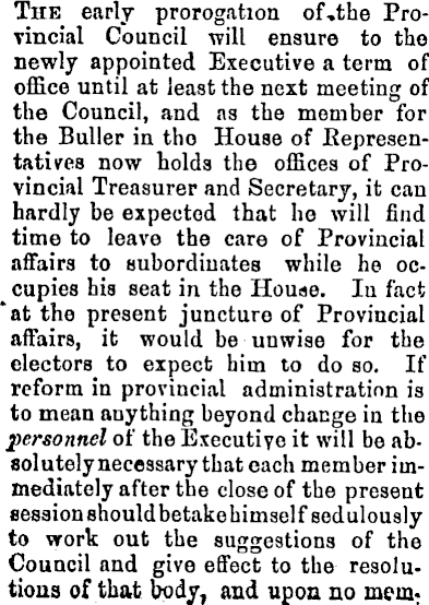 The early prorogation of,the Provincial Council will ensure to the newly appointed Executive a term of office until at least the next meeting of the Council, and as the member for the Buller in tho House of Representatives now holds the offices of Provincial Treasurer and Secretary, it can hardly be expectod that he will find time to leave the care of Provincial affairs to subordinates while he occupies his seat in the House. In fact *at the present juncture of Provincial affairs, it would be unwise for the electors to expect him to do so. If reform in provincial administration is to mean auything beyond change in the personnel of the Executive it will be absolutely necessary that each member immediately after the close of the present session should betakehimself sedulously to work out the suggestions of the Council and give effect to the resolutions of that body, and upon no inein.
