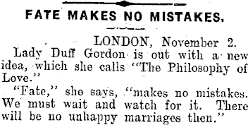FATE MAKES NO MISTAKES. LONDON, November 2. Lady Duff Gordon l is out with a’ new idea, which she calls “The Philosophy of Love.” “Fate,” she says, “makes no mistakes. We must wait and watch for it. There will be no unhappy marriages then.”
