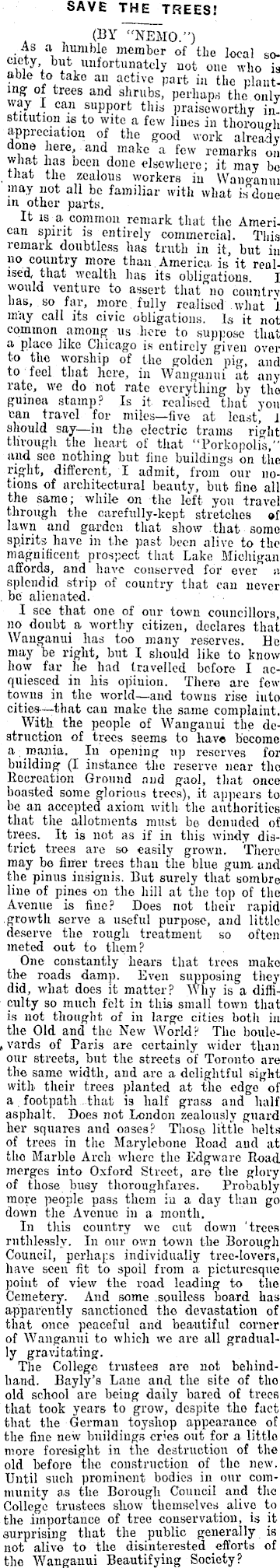 SAVE THE TREES! (BY “NEMO.”) . As a humble member of the local socioty but unfortunately not one who is able to take an active part in the planting of trees and shrubs, perhaps the only ivay I can support this praiseworthy in. stitutiqn is to witc a few lines in thorough appreciation of the good work already done here, and make a few remarks on what has ocen done elsewhere; it may be , th at the zealous workers in Wanoanm may not all be familiar with what hTdoue m other parts. It is a common remark that the American spirit is entirely commercial. This remark doubtless has truth in it, but in no country more than America is it realised, that wealth has its obligations I would venture to assert that no country has, so far, more, fully realised what 1 may call its civic obligations. Is it not common among ns here to suppose that a place like Chicago is entirely given over to the worship of the golden pig, and to feel that here, in Wanganui at any rate, we do not rate everything by the guinea stamp? Is it realised that yon can travel for miles—five at least, i should say—in the electric trains right through the heart of that “Porkopolis,” and see nothing hut fine buildings on the right, different, I admit, from our notions of architectural beauty, but fine all the same; while on the left you travel through the carefully-kept stretches »f lawn and garden that show that some spirits have in the past been alive to the magnificent prospect that Lake Michigan affords, and have conserved for ever a splendid strip of country that can never , be alienated. I see that one of our town councillors, no doubt a worthy citizen, declares that Wanganui has too many reserves. He may be right, but I should like to know how far he had travelled before I acquiesced in his opinion. There arc few towns in the world—and towns rise into cities—that can make the same complaint. With the people of Wanganui the destruction of trees seems to have become a mania. In opening up reserves for building (I instance the reserve near the Recreation Ground mid gaol, that once boasted some glorious trees), it appears to be an accepted axiom with the authorities that the allotments must be denuded of trees. It is not as if in this windy district trees are so easily grown. There may bo finer trees than the blue gum, and the pinus insignis. But surely that sombre line of pines on tho hill at the top of the Avenue is fine? Does not their rapid growth serve a useful purpose, and little deserve tho rough treatment so often meted out to them? One constantly hears that trees make the roads damp. Even supposing they did, what does it matter? Why is a difficulty so much felt in this small town that is not thought of in large cities both in the Old and the New World? The boule- , vards of Paris are certainly wider than our streets, but the streets of Toronto are tile same width, and are a delightful sight with their trees planted at the edge of a footpath that is half grass and half asphalt. Does not London zealously guard her squares and oases? Those little bolts of trees in the Marylcbone Road and at tho Marble Arch where tho Edgwarc Road merges into Oxford Street, are the glory of those busy thoroughfares. Probably more people pass them in a day than go down the Avenue in a month. In this country wo cut down ‘trees ruthlessly. In our own town the Borough Council, perhaps individually tree-lovers, have seen fit to spoil from a picturesque point of view the road leading to the Cemetery. And some soulless board has apparently sanctioned tho devastation of that once peaceful and beautiful corner of Wanganui to which we are all gradually gravitating. The College trustees are not behindhand. Bayly’s Lane and the site of tho old school are being daily bared of trees that took years to grow, despite the fact that the German toyshop appearance of the fine new buildings cries out for a little more foresight in the destruction of the old before the construction of tho new. Until such prominent bodies in our community a.s the Borough Council and the College trustees show themselves alive to the importance of tree conservation, is it surprising that the public generally is not alive to the disinterested efforts of tho Wanganui Beautifying Society?