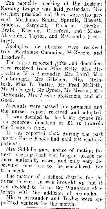 The ' mphthly meeting of - tlie Nursing League was held . yesterday. Mrs Kitchen presided, and. there wore also present— Mesdames .Smith,. Spindle," Bassett, Siddells, Sargcant, Christie, Dawkiu, Braik, Keesing,, Crawford, and ; Misses Alexander, Taylor, and Neivcombe (secretary). Apologies for absence were received from Mesdames Cummins, McKenzie, and Treadwell. The nurse, reported gifts and donations were received from Miss Kelly, Mrs MeParlane, Miss Alexander, Mrs Laird, Mrs Couborough, Mrs Kitchen, Miss Mclntosh, Miss L. Battle, Mr Fred Mcßeth, Mr McDougal, Mr Symes, Mr Messon, Mrs McKenzie, Mrs Archie McKenzie, and Mr Good. . ; Accounts v/ere passed for payment and the nurse’s report received and adopted. It was decided to thank Mr 3 vines for his generous donation of £1 is' towards the League's fund. It was reported that .during' the past ' mouth■ Nlirse Knobs had paid 294 visits Mb patients. , ■ Mrs Siddells- gave notice of- motfon for next meeting, that the League accept no more maternity eases, and only very deserving ones are to be considered for treatment. The matter of a defined district for the nurse to work in was brought up and it was decided to fix on the Wanganui electorate with the addition of Aramohb. Misses Alexander and Taylor were appointed visitors for the month. • '