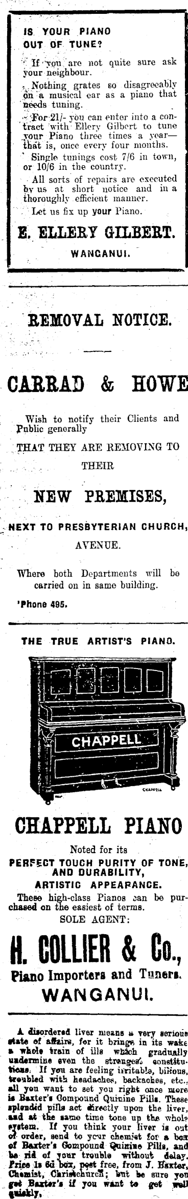 IS YOUR PIANO OUT OF TUNE? ■ If‘'you/ arc not quite sure ask your neighbour. Nothing grates so disagreeably on a musical ear as a piano that tweeds tuning. ••r;i'or:2l/- you can enter into a contract ■with Ellery Gilbert to tune .your Piano three times a year—that is, once every four months. Single tunings cost 7/6 in town, or 10/6 in the country. • All sorts of repairs are executed by us at short notice and in a thoroughly efficient manner. . Let us fix up your Piano. E, ELLERY GILBERT. WANGANUI. REMOVAL NOTICE. CARRAD & HOWE Wish to notify their Clients and JPpblic generally THAT THEY ARE REMOVING TO THEIR NEW PREMISES, NEXT TO PRESBYTERIAN CHURCH, AVENUE. Where both Departments will be carried on in same building. ’Phone 495. THE TRUE ARTIST’S PIANO. CHAPPELL PIANO Noted for its PERFECT TOUCH PURITY OF TONE, AND DURABILITY, ARTISTIC APPEARANCE. These high-class Pianos can be purchased on the easiest of terms. SOLE AGENT; H. COLLIER & tn. Piano Importers and Tanere. WANGANUI. A disordered liver means a very serious state of affaire, for it bringa in its wake » whole train of ills whaoh gradually uadermins even the strangest constitutions. If yen are feeling irritable, bilious, troubled with headaches, backaches, etc., all yea want to set you right once more k Baxter’s Compound Quinine Fills. These splendid pills act directly upon the liver, and at the same time tone up the whole system. If you think your liver is out «*- order, send to year chemist for a box of Baxter’s Compound Quinine Pills, and be xid of your trouble without delay. Plies .Is 8d box, port free, from J. Barter, Chemist, ChruAchnrcS; but be sure you _ fed Baxter’s if you want to get w»U fiiokly.