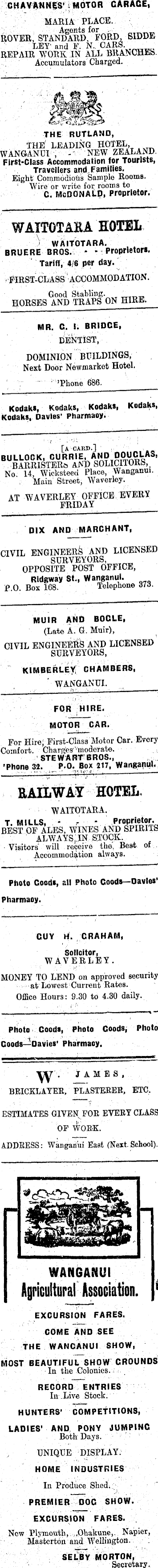 CHAVANNES’; MOTOR GARAGE. MARIA PLACE. Agents for , HOVER, STANDARD, FORD, SIDDE LEY' and F- N., CARS. T REPAIR WORK IN ALL BRANCHES. Accumulators Charged. cm THE RUTLAND, THE' LEADING HOTEL WANGANUI v - ' NEW ZEALAND. First-Class Accommodation for Tourists, Travellers and, Families, Eight Commodious Sample Rooms. ’ Wire or write for rooms to G. MCDONALD, proprietor. WAITOTAEA HOTEL .■ ■:/.■■■■ WAITOTARA. : BRUERE BROS. • • Proprietors. Tariff, 4/6 per day. ■ FIRST-CLASS ACCOMMODATION. Good Stabling. _ HORSES AND TRAPS ON HIRE. MR. G. I. BRIDGE, DENTIST, DOMINION BUILDINGS, Next Door Newmarket Hotel. ’Phone 686. Kodaks, Kodaks, Kodaks, Kodaks, Kodaks, Davies’ Pharmacy. [A CAED.] ... ULLOCK. CURRIE, AND DOUGLAS, BARRISTERS AND SOLICITORS,. Sfo 14, Wicksteed Place, Wanganui. . Main Street, Waverley. at waverley office every FRIDAY DIX AND MARCHANT, CIVIL AND LICENSED SURVEYORS, OPPOSITE POST OFFICE, Rldgway St., Wanganui. P.O. Box 168. Telephone 373. MUIR AND BOGLE, (Late A. G. Muir), CIVIL ENGINEERS AND LICENSED SURVEYORS, kimberley; chambers, ' WANGANUI. j|t FOR HIRE. MOTOR CAR. For Hire; First-Class Motor Car. Every Comfort. Charges'’-moderate. STEW ART'BROS., ’Phone 32. P.O. Box 217, Wanganui. eailwmhotel. WAITOTARA. r. MILLS. ■ r ■ Proprietor. EST OF ALES, WINES AND SPIRITS ■ ALWAYS;JN STOCK. Visitors' will receive the, Best of Accommodation always. Photo Goode, all Photo Goods— Davies’ Pharmacy. GUY W. GRAHAM, Solicitor, WAVERLEY. MONEY TO LEND on approved security at Lowest Current Rates. Office Hours: 9.30 to 4.30 daily. Photo Goods, Photo Goods; Photo Goods—Davies’ Pharmacy, . yjf. : JAM E S BRICKLAYER, PLASTERER, ETC. ESTIMATES GIVEN FOR EVERY CLASS OP WORK. ADDRESS: Wanganui East (Next.School). WAH6ANUI Agricultural Association. EXCURSION FARES. COME AND SEE THE wancAnui SHOW, MOST BEAUTIFUL SHOW GROUNDS In the Colonies. : RECORD ENTRIES In .Live Stock. HUNTERS’ COMPETITIONS, LADIES' AND PONY JUMPING Both Days. , UNIQUE DISPLAY. HOME INDUSTRIES In Produce Shed;, PREMIER DOC SHOW. EXCURSION FARES. / New Plymouth,...Ohakune,. Napier, Masterton and Wellington. ' : SELBY MORTON, Secretary,