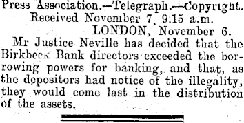 Press Association.—Telegraph.—Copyright. Received November 7, 9.15 a.m. LONDON, November 6. Mr Justice Neville has decided that the Birkbecx Bank directors exceeded tbe borrowing powers for banking, and thaj;, as the depositors had notice of the illegality, they would come last in the distribution Of the assets. '
