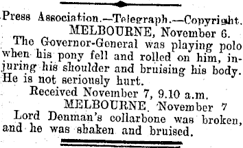 >Piess Association.—Telegraph.—CopyriuJit. , MELBOURNE, November 6. ITie Governor-General was playing polo when his pony fell and rolled on him, inuring his shoulder and bruising his body. He is not seriously hurt. Received November 7, 9.10 a.m. MELBOURNE. November 7 Lord Denman’s collarbone was broken, and he was shaken and bruised.