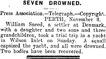 SEVEN DROWNED. Press Association.—Telegraph.—Copyright. PERTH, November 0. William Sneed, a settler at Denmark, with a daughter and two sons and three grandchildren, took a trial trip in a yacht in Wilson Inlet on Sunday. A squall capsized the yacht, and all were drowned. Two bodies have been recovered.