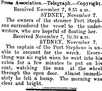 Pres* Association.—Telegraph.—Copyright. Received November 7, 8.55 a.m. SYDNEY', November 7. Tho owners of tho steamer Port Stephens surrendered tho vessel to the underwriters, who are hopeful of floating her. Received November 7, 10.30 a.m. SYDNEY, November 7. The captain of the Port Stephens is unable to account for tho wreck. Everything was ail right when he went into his cabin for a few minutes to put on bis coat, watching the man at the wheel through the open door. Almost immediately he felt a bump. The morning was clear and bright.
