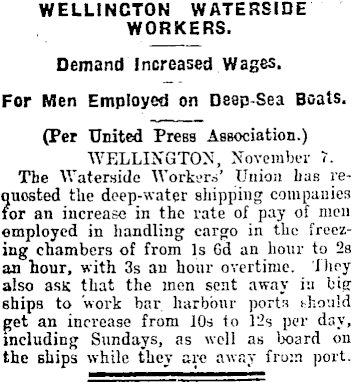 WELLINGTON WATERSIDE WORKERS. Demand Increased Wages. For Men Employed on Deep-Sea Boats. (Per United Press Association.) WELLINGTON, November 7. The Waterside Workers’ Union has re- ? nested the deep-water shipping companies or an increase in the rate of pay of men employed in handling cargo in the freezing chambers of from Is Gd an hour to 2s an hour, with 3s an hour overtime, i hey also asg that the men sent away in big ships to work bar harbour porta should get an increase from JOs to Pis per day, including Sundays, as well as board on the ships while they are away from port.