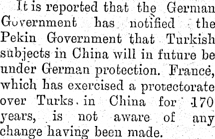 It is reported that the German Government has notified the Pekin Government that Turkish subjects in China will in future be under German protection. France, which has exercised a protectorate over Turks, in China for -170 years, is not aware of any change having been made.