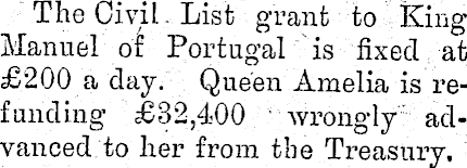 The Civil. List grant to KingManuel of Portugal is fixed at £2OO a day. Queen Amelia is refunding £32,400 wrongly advanced to her from the Treasury,