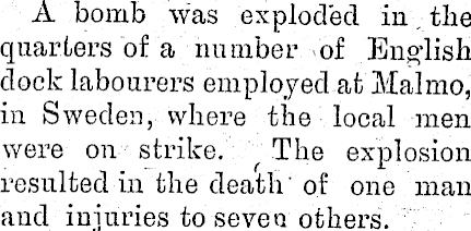 A bomb was exploded in the quarters of a number of English dock labourers employed at Malmo, in Sweden, where the local men were on strike. , The explosion resulted in the death' of one man and injuries to seven others.