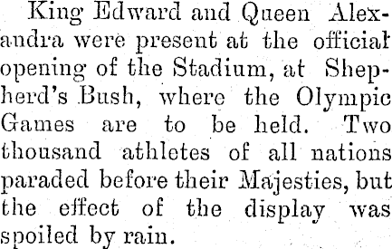 King Edward and Queen Alexandra were present at the official’ opening of the Stadium, at Shepherd’s Bush, where the Olympic Games are to be held. Two thousand athletes of all nations paraded before their Majesties, but the effect of the display was spoiled by rain.