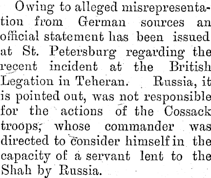 Owing to alleged misrepresentation from German sources an official statement has been issued at St. Petersburg regarding the recent incident at the British Legation in Teheran. Russia, it is pointed out, was not responsible for the actions of the Cossack troops; whose commander was directed to consider himself in the capacity of a servant lent to the Shah by Russia.
