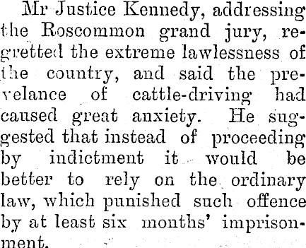 Mr Justice Kennedy, addressing the Roscommon grand jury, regretted the extreme lawlessness of the country, and said the prevelance of cattle-driving had caused great anxiety. He suggested that instead of proceeding by indictment it would be better to rely on the ordinary law, which punished such offence by at least six months’ imprisonment.