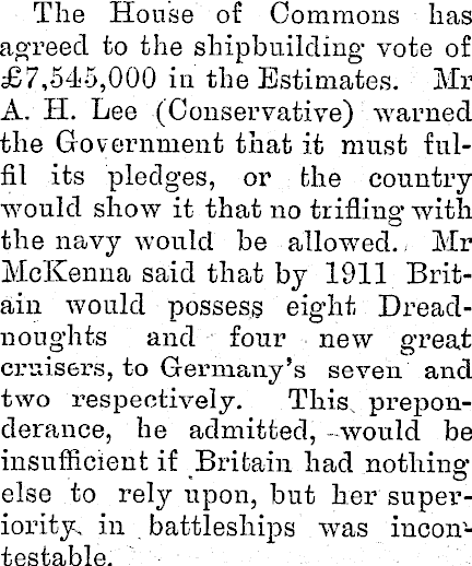 The House of Commons has agreed to the shipbuilding vote of £7,545,000 in the Estimates. Mr A. H. Lee (Conservative) warned the Government that it must fulfil its pledges, or the country would show it that no trifling with the navy would be allowed. Mr McKenna said that by 1911 Britain would possess eight Dreadnoughts and four new great cruisers, to Germany’s seven and two respectively. This preponderance, he admitted, would be insufficient if Britain had nothingelse to rely upon, but her superiority. in battleships was incontestable.