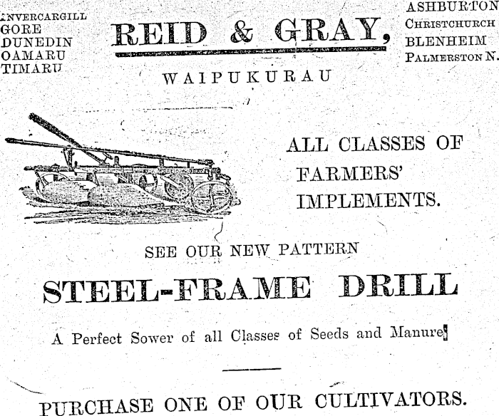 ASHBURTON GO V RE CAKGILL -RTT’T'n & ftEAYa Christchurch DUNEDIN JILJILJLJLJ ■ JLaLCa_ JL $ BLENHEIM OAMAR U Palmerston N. TIMABU , WAIPUKURAU .7 —Y ~ . ALL CLASSES 01? FARMERS’ ■ IMPLEMENTS. SEE OUR NEW PATTERN STEEL-FRAME DRILL A Perfect Sower of all Classes of Seeds and Mannrej PURCHASE ONE OF OUR CULTIVATORS.