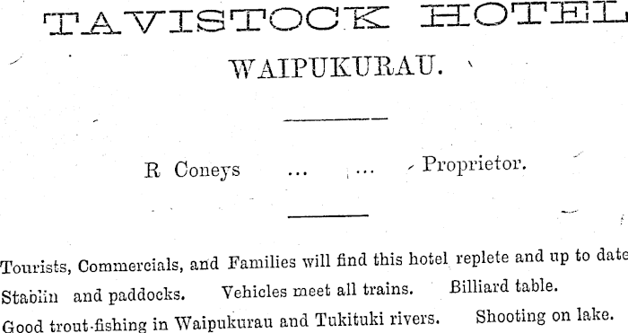 TAVISTOCK HOTEL WAIPUKURAU. - R Coneys ' Proprietor. Tourists, Commercials, and Families will find this hotel replete and up to date Stablin and paddocks. Vehicles meet all trains. Billiard table. Good trout-fishing in Waipukurau and Tukituki rivers. Shooting on lake.