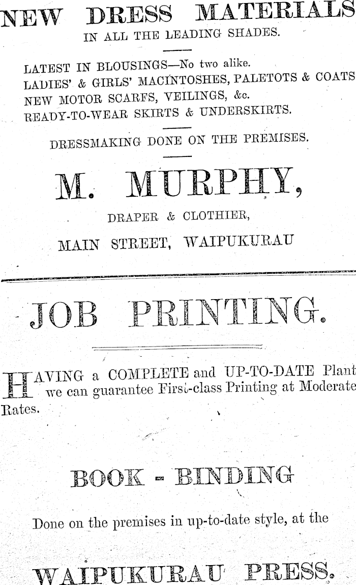 NEW DRESS MATERIALS IN ALL THE LEADING SHADES. LATEST IN BLOUSINGS —No two alike. LADIES’ & GIRLS’ MACINTOSHES, PALETOTS & COATS NEW MOTOR SCARFS, VEILINGS, &c. READY-TO-WEAR SKIRTS & UNDERSKIRTS. DRESSMAKING DONE ON THE PREMISES. M. MURPHY, DRAPER & CLOTHIER, MAIN STREET, WAIPUKURAU JOB PRINTING. TTAVING a COMPLETE and UP-TO-DATE Plant rj we can guarantee First-class Printing at Moderate Rates. , BOOK - BINDING Done on the premises in up-to-date style, at the WAIPUKURAU PRESS.
