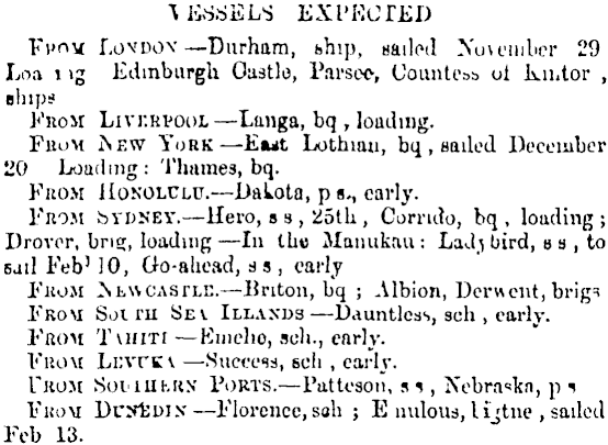 A ivS-SELS EXPECTED Yvnv 1. 0s dos — Durham, ship, nailed Xuu'iulicr 29 Loa I>g Edinburgh Oastlo, Parsee, Countess ol kn.tor , eliips ]'rom Livkkvodl — Langa, bq , loading. PiioM Akw York — Eut Lutbmn, bq , sailed December 20 Loading: Thames, bq. Fuom Honolulu. — Dakota, p s., cavly. l'no>t bYDNEY. — Hero, ss , 25tk , Currido, bq , loading ; Drover, briEc, loading — In the Manukau : Lad^ bird, us, to sail Feb 5 10, Go-alicad, a s , early I'uoM — Enton, bq ; Albion, Derwent, brig^ I'rom Sol ru Sev Illaxds — Dauntless, sch , early. From Tuim — Kuielio, sch., early. l«'uo\t Li:vrtv — Suefess, sch , early. Tkom SoniihKN Torts. — l'attosou, »i , Ivebra'skn, p Fkom Dryfcui.v — Florence, soh ; E uulous, I ljtne , sailed Fob 13.