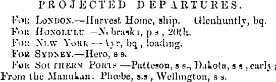 PROJECTED DEPARTURES. Foil London. — Harvest Home, ship. iHenliuntlr, bq. You HoxoTii'LC — Nibrmki, ps , 2Otli. Ron Xi.w York — \\r, bq, loading. Fob Syd>ey. — Hero.ss* Koit tjoi niEJiv Pokih — Puttcson, ss n D.i Lota, ss , car]_j ; From tbc MaimUan. Pliosbc, s.s , Wellington, s s.