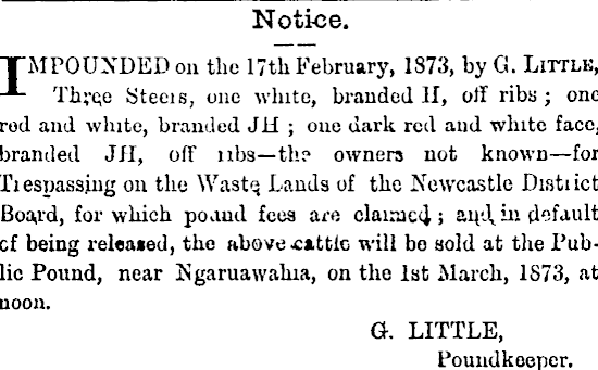 Notice. TTMPOUNDED on the 17th February, 1873, by G. Little, -*- Thye,e Steeis, one white, branded 11, off ribs; one rod and white, branded JH ; one dark red and white face, branded JH, off nbs— th? owners not known — for Tiespassjng on the Wastq Lands of the Newcastle Distiict Board, for which poand fees are claimed; ; &uA & default cf being released, the above cattle will bo sold at the Public Pound, near Ngaruawahia, on the Ist March, 1873, at noon. a. LITTLE, Pouudkeeper.