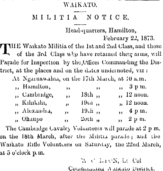 WAIKATO. MILITIA NOTICE. Head-quarters, Hamilton, February 22, 1873. TIIE Waikato Militia of the Ist and 2nd Class, aud those of the 3rd Clags \v Up have retained their, ai vis, v/ili Parade for Inspection by tho,OUicei Commanding the District, at the places and on the dates undci noted, viz : At Ngaiuawahia, on the 17th Maich, at ]0 a. in. Hamilton, „ j p in, Cam budge, 18th 12 noon. „ Kilukihi, „ l!)ui „ 12 noou. Alexandia, lihh 4 pm. „ Ohaupo 2uth „ 2p m. The Cainbudge Cavalry Voluuteeis will parade at 2 p m. on the 18th March, after the Alilitia parade ; aud the Waikato Kitle Volunteers on Saturday, tiie 22nd March, at 5 o'clock p. in. V, v 1 i.icN, Lt Col CouiQiauiaUjj i\ aaialo Disuict.