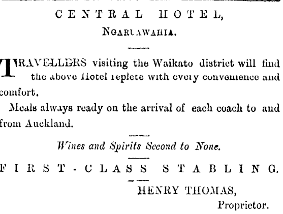 CENTRAL HOTEL, Ngabiawahia. riIRAVELLDRS visiting the Waikato district will find -*- the above Hotel leplete with eveiy cunveniencc and comfort. Meals always ready on the arrival of each coach to and from Auckland. Wines and Spirits Second to None. FIIIST-ULASS STABLING. HENRY THOMAS, Proprietor.