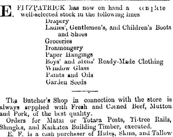 EFirZ PATRICK has now on hand a un^Ue . well-selected stock in the following lines Drapery Lames', Gentlemen's, and Children's Boots and bhouß Groceries Ironmongery Paper Hangings Boys' and ivieiit*' Roady-Made Clothing Window Glass Paints and Oils Garden Seeds Th/» Butcher's Shop in connection with the store is always arpphed with Freih and Coined Beef, Mutton aud Pork, of the best quality. Orders for Matai or Totara Posts, Ti-treo Rails, Shmglts, and Kaikatca Building Timber, executed. E. Y. id a cash purchaser of Hides, Skins, and Tallow