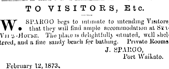 TO VISITORS, Etc. WSPARQ-0 begs to intimate to intending Visitors, • that they will find ample accommodation at StyVn V'-Hoi'm:. Tbo plate is dehghtlullj situated, well sheltered, aud a line sandy bench lor bathing. Privato Rooms. J. HPARGO, Port Waikato. February 12, 1873,