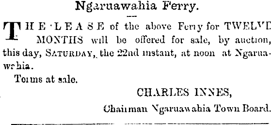 1 Ngaruawahia Ferry. miIE'LEASE of the above Feny for TWF,L Y E -•- MONTHS will bo offered for sale, by auction, this day, SATUiU)AY K tlie 22nd instant, at noon at Ngaruawrhia. Toims at sale. CHARLES INNES, Chaiimau Vgaruaw ahia Town Board.