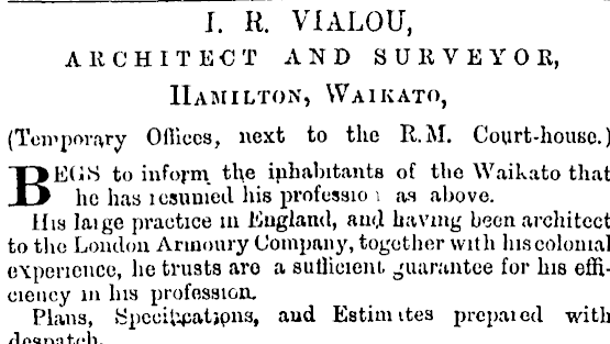 I. R. VIALOU, ARCHITECT AND SURVEYOR, Hamilton, Waikato, (Temporary Ofliccs, next to the R.M. Court-house.) BEGS to infoj-m. the iphabitants of the Waikato that he has lcsunied his professio \ as above. His laige practice in England, and having been architect to the London Armoury Company, together with his colonial experience, he trusts are a sutlieient. guarantee for his efficiency in his profession. Plans, SpccUicatjpns, aud Estimites prepaied with I rlnanatch.
