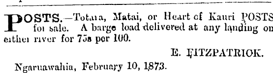 POSTS.— Total a, Matai, or Heart c{ Kauri POSTS foi bale. A barge load delivered at any landing on eithei river for 7os per IUO. E. F.ITZPATRIOK. Ngaruawahia, February 10, 1j873-
