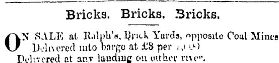 Bricks. Bricks. Bricks. ON SALE at R.ilph'n. Bjick Yards, opposite Coal Mines. Dclncred into bnr^o at £8 per i ,n» Delircrcd at any landing en wither mi 11 '.