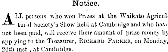 Notice. A LL pei sons Mho won Prizes at the Waikato Agricul- "^- tui-il Society's Show held at Cambndgc and who ha\c not been paid, w ill receive their amount of prize money by applying to the Treasurer, Richard Parker, on Monday, 24th mst., at Cainbudge.