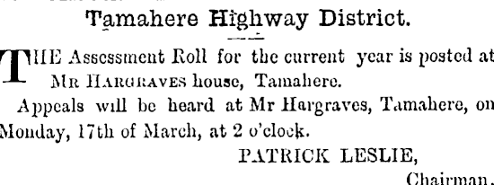 Tamahere Highway District. TIIE Assessment Roll for the current year is posted at Mr Haru haves house, Tamahere. Appeals will be heard at Mr Hargraves, Tamahere, on Monday, 17 th of March, at 2 o'clock. PATRICK LESLIE, Chairman.