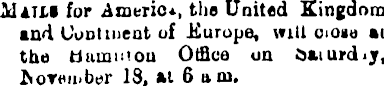 MllLt for Americ*, tlie United Kingdom inH Coot meat of Europe, will cio§« x the buininou Office on damrdij, >oTen.ber IS, M 6 a m.