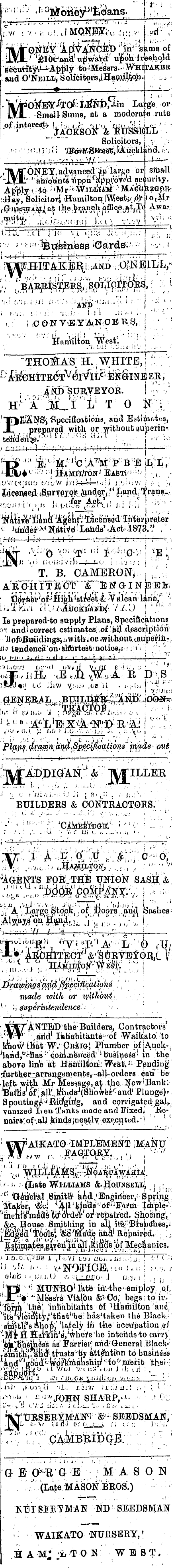 I^/ir'QNEY 1 id^A'NCEb ''ifr'Wnja of •iWL' 'd&idtWl' u^Vatd' u^o'b lrkh P ;d a^curity t . i - i 'Aptiiy to-Measrs.- 1 WHi|rAKEB and O'NBiLiii Solicitors j.Hamj^tp)}. :j - . '■■■■♦ ■' — — '■—-"' /M/|i6^EY^T(>^LE'Ni), < lin Larg^e or IJfJL. Small Snins, at a moderate rate l^^^ %^j^ L '/ Solicitors, -. --. : -- -?-: • :<■.?! j«'i r ;F^Wg»^g^iAtfckl|ind. r •» ; • .YAr,-::Lu^tf \ . " Ui -- MONEY, advanced JBlarfee or small ''km'oon^^ppn approved sec urity. A bply t•to•• Mr: * WiMit W ■'■ M Atfa &hq f>R■Jjay, Solicitorl Hamilton !Wesfc/.6> t.o t M.r • fGipj^A^^at ihe^ran^hb.fnc^LatfTd Away sf&i: '. ' ' .v i . jv*>'h j iu i ia' i ■. _jakvj-4iL:; ■"■••' >;^" ;^Brtsiiifess i Cardl»-';- ■■;-.' I-:' •;/ .. ; i; OGN Y'EYiANiOB K^j: j •' ; 1.."'-'"'"' ' '"' ; Hamilton. Wcsfcl'^.l; ; ; ' THOItAS. H. t WHITB,| J 1° Xi^HiTEd^ervii^iNSiN^ m , .- ANJ) SURVEYOR. I •!•-, . H^A^MJi:'''^ t ; o jr;;;r_ 'TpJili'ANlSi'fpecifioatipna, and Estimate^, ■ prepared with or without auperin-. teiident-' uU ' ; "" J(!>; Hi>T = • • '• ' i - ! j — :"i- -i :'":v: : -i i;:-.,i v!: «■■ ; ■j .- '■' *|j? li( 'E^^/^C^^P^B^iE Il'L,---i-JD|;# < -' ;: -' ; '|HAMri,lr6]sr J EA'BTi ii:;i ' ! -. ( . ■ L.iceiwed : (S,urYPjp.r Jindqrj,/' Land, Trans^, ! i:v;« i.oiift^K.i J;i }•;! j-^ ' '^afay^ L'ana^Agent I .' iiice'nisod Infer preter '*> >( NiatiVe' ' Lahds' t Acit. '187,% 7 . ■ ; j-rri J ::; — i-.n ':'. v.j^:i,. i, :< ., | ;.■ -i '«& .vL-c d yni.^n i.:i i-y'^G-^i -%\; T^B. CAMERON> j , '. .■ a'r oil Tte i ctT & ~e jst g me eb 1 GJrtlPof^fiign'^t^eVifc-Viiica^lan;^ y L/iTrl.-i c'UiiAuckiA'ai^- ViU) | li! " " Is prepared-to supply Plans, Specifications m andi correct estimates: , of ' all .description > iiofi»Baiidingß-,i) wibh«or.vwiLhout.tßuperiii: , aj tendencSonshbrteat nolice.i : i j .'"'•'",.' I>. >.lt,. .1, i\ : ; f<:« - .j T>< f »i •»' ', . .' I '■ _ ." ."tlullVi CiL»«l OV*li V^jll fclu. •;''•'',. oJlTwiiH* .-iB tJ H R. D^S GENERAL .. BniLlp&s^liUO€H*^ .". ■ i.' ,',/ i 'i . :"(,.' ' U i; i- i i 1 1 '. * ' r- . i ' * ■ PUyis, <^ra^n^and^j»j^lJiisaUons'jnade'ovt .'—?—- — f* — fe v l'.\ ... : — ; — — . '. . , .-,... •"I '^akdi^an; v & filler j BUILDERS & CONTRAOTOES. . ;•- ,-i^-i;. J >v i= -'-"'■" ' ;..•■.: .'. ; v •• Vf ait t, ..„.,.;. < ■ - . . ' !• ;-•■' .' :> ;■. — Li -^- — 1- ] ' •-' ■--=■-•. "AGENTS FOR' THE FNION SASH & j, A t j Large. Stop.k^ o^ Ji ip.oors. v an^ basheß ; Al^ay/on'Hiiiid,:^ j ' \.°, .'" • v | . S. I!.".:-. V/ i. "d r ,^:r,,/; ft . j tyf J H.'' '*yi?iOAt- : h ii 0 ( V, ?*>•; AITOmTEd^ &' f S I!JRtEY(i)IS,C V Drdynnsfs'an'd^eci^cattohs r .'."'.' ??tacife to^A or x^toiti *■'. ;i Superintendence' ;■' ' TTSTANTM) the Builders. Contractors' '^W- ; ,and l Ikhabitants-'-of Waikatd to 1 kbow IHat Wv Cbaiq-J Plumber of jAuck-. 'misiness' m the above link at Hamil^ons West. s - Pending rfurtherrarrangements,— all-orders cari : be rleft with Mr Mesaage t atthe. New(Bank; "Bat-hVof ;all / ,^ii»ds J (Showfer f 'and ) Plunge)Spoutingy.>ifiidfeirig, and cprrigated^gal,. vanized li&n Tanks made and Fixed* lieDairslo^aU Jciudsjne^ly excused, i ' ( W'AIEATG IMIPLTESMENT SMANU ;;■ :^tt^^^^iA|. v i. j. (Late WikiiamS &.Hounsbl)4 . } ; ;.., (! 'General SbitH 1 aid^Engiileer,' Spring Maker, •&£ of ;i Fnrm Imple-' 'mvWtn&<&WM& J ot repaired. SUooirig, &c, Houee Smjtliing m all it"s : 'Brabdbes,i i'Eam'foolbF&o'l&a^e andt Repaired.; : ; Est m J a ,teB I g\Yen i jnaJ.l|Kmaß,of Mecuanics. ■< ifl.O: t;rJJB 1 ,tbVI tyj ijok. Hi ■..■'■.,;• ! '' r ( : ' ii -,k * : vNO'TIG-Bi-.t-o .-..ii ;■'.-:, .| olfcfc •• < JJi 1. (J /; :j • ffWi. 1 . C;jj 1 ! ,.j !*0 l '■ MUNtRO 1 late id'. th^emptoy ; !oJ, "-Jt^V^MessVs'Vialbu &VCd, begs; to ic,' 'fqrin the inlinbitahts 6f ''Haini'lton'anc' li itß^icinity, Ji t&at''he ! has Itaken1 taken the Black ' s^tlfs Shop; ,' 'lately m the occupation ,(ii -Mi Et fiaVlfln'd, J^herc ! he intehdsto carry '£k k ßWne'ss as Farrier atid J General Black/ .BrnitCjran^ 1 ttusts^by .^'tt&itibn tp busiridss and ei eood^wb?k < mah3nip' >i to o .niißrit' 'the-; 'suDiJo^e »'V/oi. v.- 1 i,«..M.i;b 1 ri ! ; .. iJJO'f, L o'iq J .gi .'Ui.-C« v. f ■;;■». ' ■ ' TiT tIRSERYM'AN 1 ! »?•- SEEDSMAN; : O EP'G'E ;MAS O H . BROSO - ; KtIBIBTM-AK ND SEEDSMAN •'•• WAIKATO NUESERY, 1 H A -M I '> T0 N WES T .
